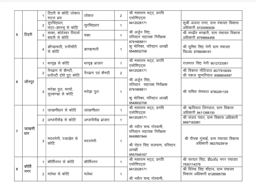 जारी रूट चार्ट के अनुसार नरेंद्रनगर, भिलंगना, थौलधार-चंबा, जौनपुर, जाखणीधार, कीर्तिनगर, प्रतापनगर विकासखंडों सहित जिला मुख्यालय से संबंधित मार्गों को शामिल किया गया है।